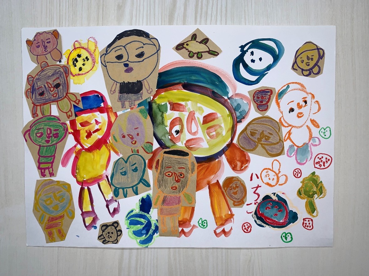 みんなでにぎやかに苺狩りをしている絵を描きました。人間だけではなく、うさぎや魚も苺狩りを楽しんでいます。水彩絵の具や色鉛筆、水性マーカー、クレパスといろんな画材を使って描いたり、切ったり貼ったりして作成しました。